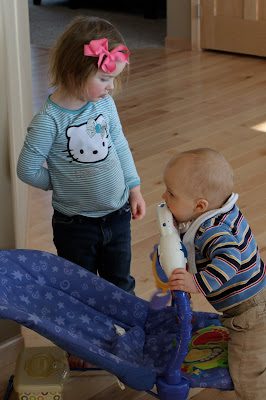 With this little one around, there is never a dull moment. I took these pictures the other day when Wyatt and Sadie were playing in our room and I was ironing some shirts. She was 'feeding baby with a nursing cover' and at one point, i actually heard her say to Wyatt, "I can't go yet. I have to feed baby on the other side." She has always loved playing 'mommy', but now her play has been taken to a whole new level by watching me with Blake.